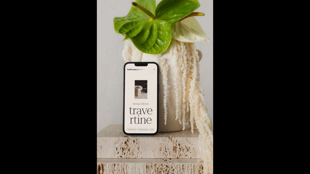 A sophisticated iPhone mockup set in a minimalistic interior with elegant travertine accents—perfect for showcasing your designs with style.