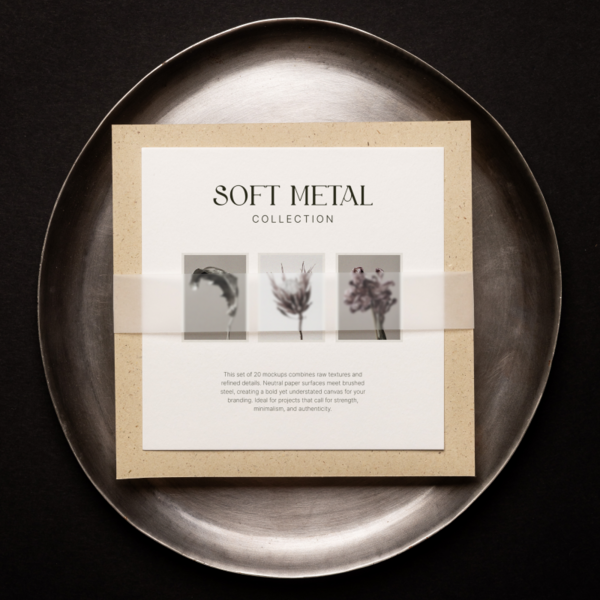 Qty: 1Introducing the Soft Metal Mockup Collection — 13 Premium PSD Mockups, featuring a curated set of lifestyle and product presentation scenes. Captured on sleek silver trays against deep black backgrounds, this collection combines modern metallic accents with authentic textures, creating a sophisticated and minimalistic stage for your designs.