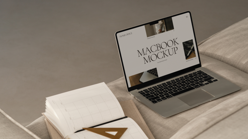 Featuring a warm and modern interior, this stunning MacBook mockup is perfect for showcasing your designs.